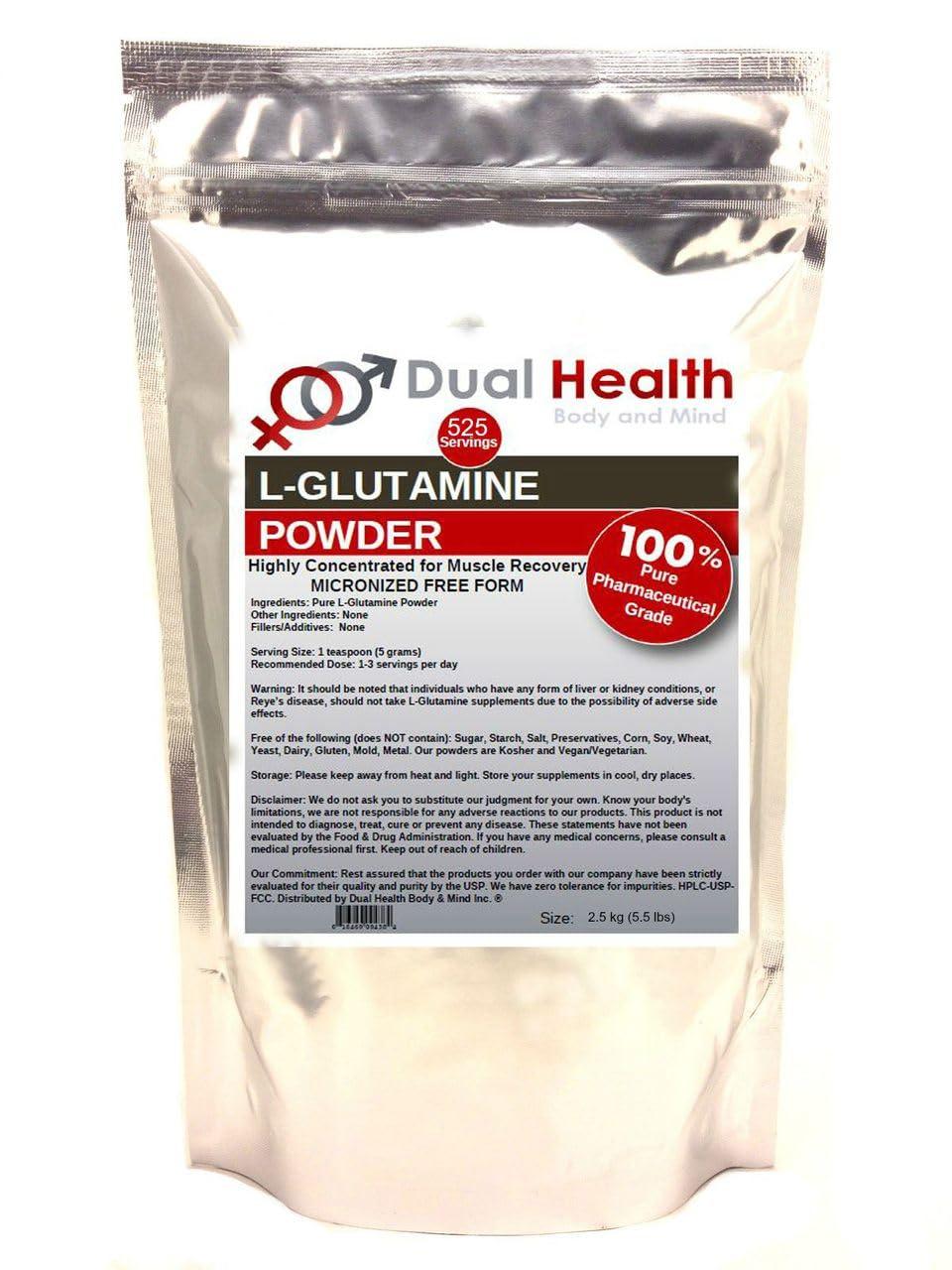 Dual Health Body & Mind L-Glutamine (2.5kg - 2500g - 5.5 lbs) Pure Powder 5000mg Free Form Bulk Supplements, Made in USA, Immune Digestion GI Support Leaky Gut Health Muscle Energy Stamina Endurance Strength